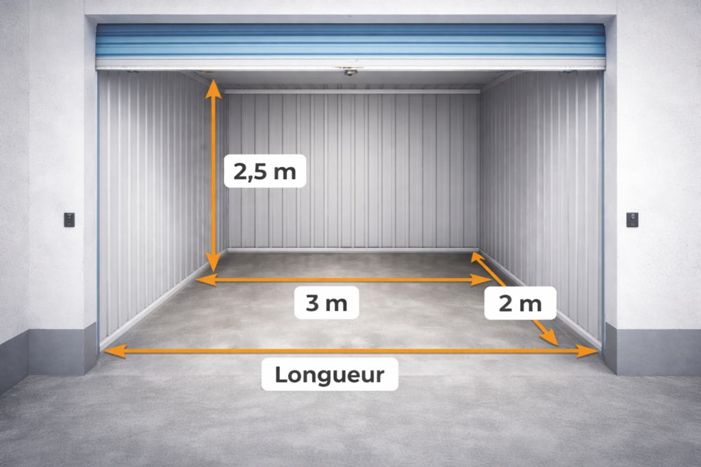 💡 En moyenne, 1 m² ≈ 2,5 m³ de volume (hauteur standard). Certains box proposent des hauteurs plus importantes, mais il est parfois compliqué d’exploiter toute la hauteur réelle d’un box de stockage.